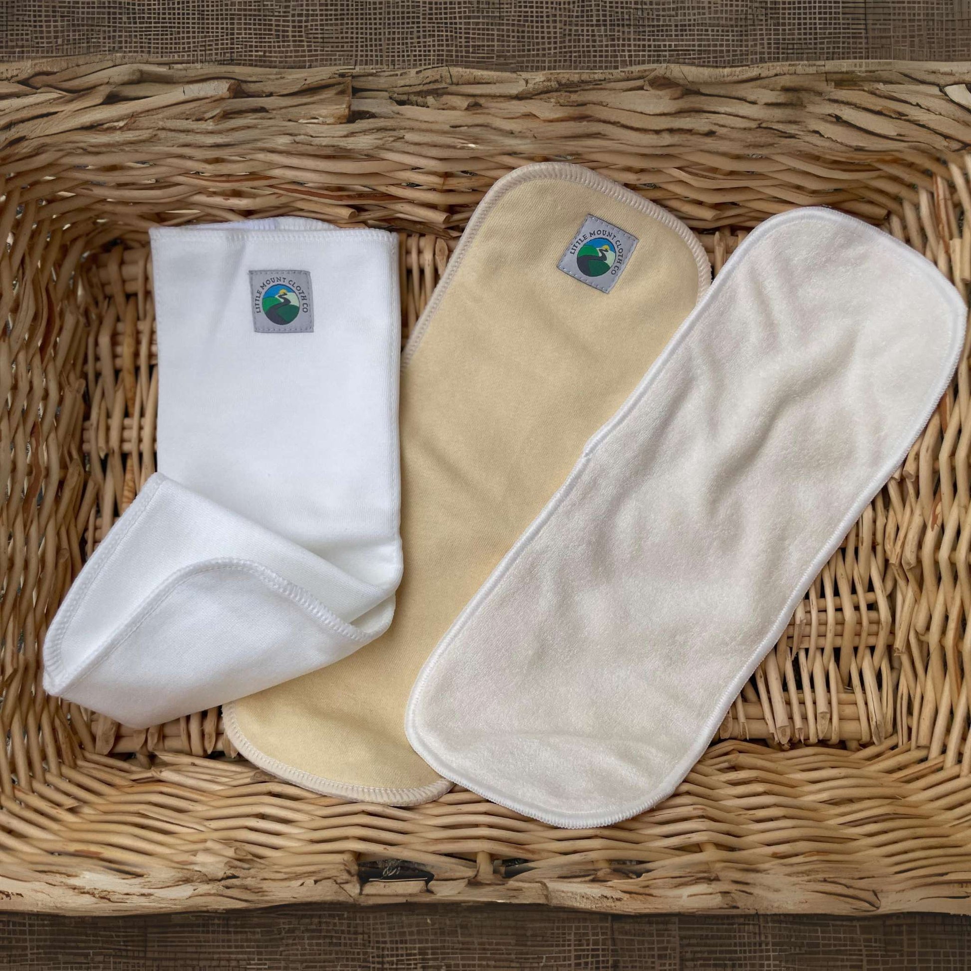 You'll receive: (1) 2-Layer Bamboo Cotton Trifold, (1) 3-Layer Hemp Cotton Insert, and (1) 4-layer Bamboo Terry Insert